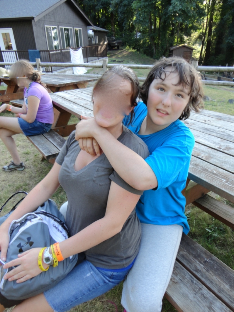 For the next hour, my full attention was focused on ushering Aida from the car through the check-in process, talking to the counselors and nurses over the sound of her screams, grabbing hold of her arms when she tried to bite her hands in frustration, taking advantage of any slight lull in her hysteria to repeat to her that there would be swimming and snacks and dinner – all things she loved – at camp. Taking courage and hope from the fact that she would sign these things back to me, so I knew she was “hearing” me even through her continued state of meltdown.