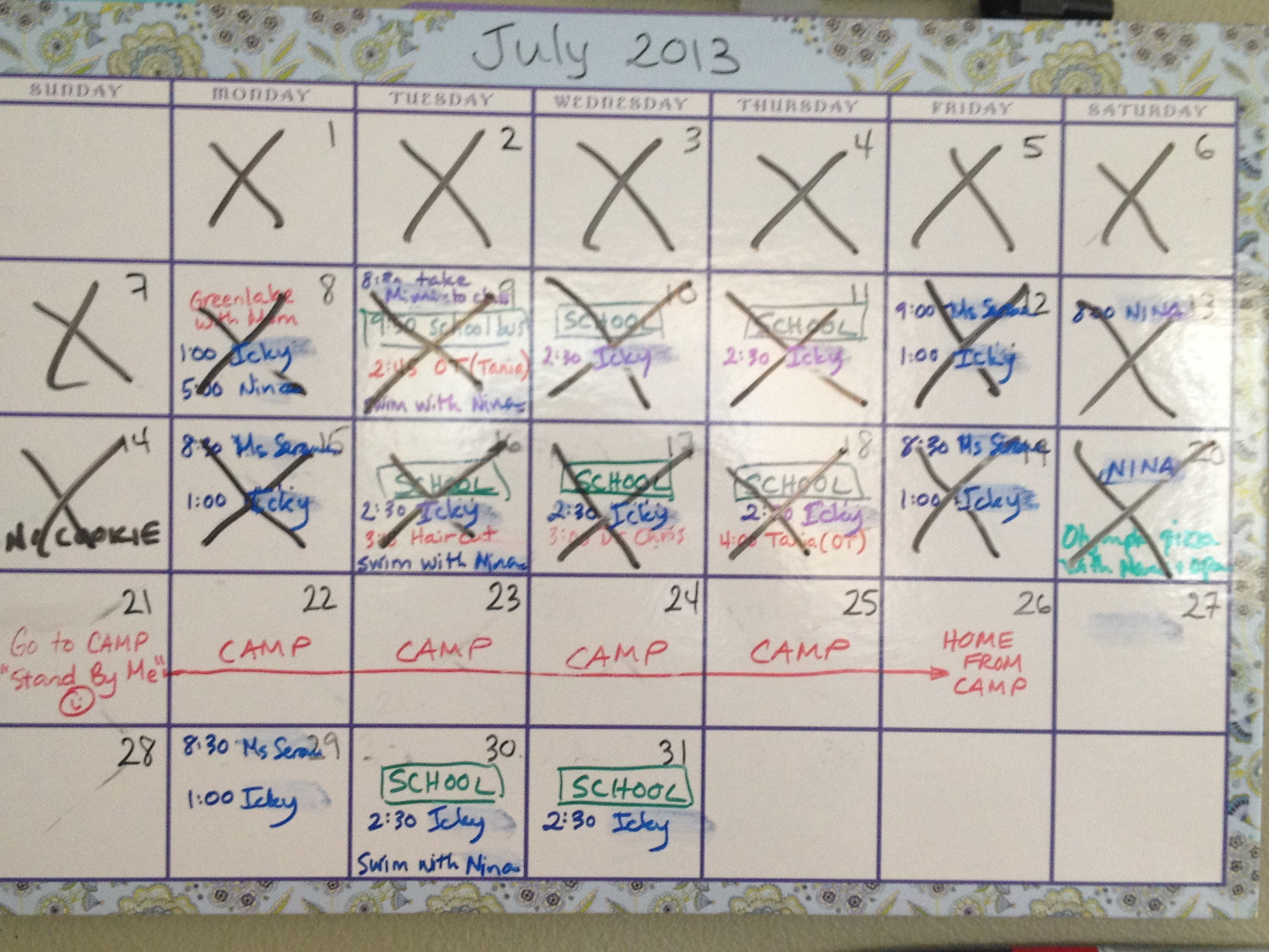 Yesterday I loaded Aida in the car with all her luggage to take her to what I guess has now officially, three years in, become an annual camp session. Ever since her July calendar went up, Aida has been happily signing “camp” to us (or “camp tomorrow” which we correct to “in two weeks” or “next week” as appropriate, while we wait for her sense of time to settle into better detail), and looking through the photos that are loaded into her iPad from her two previous sessions at Camp Stand By Me.